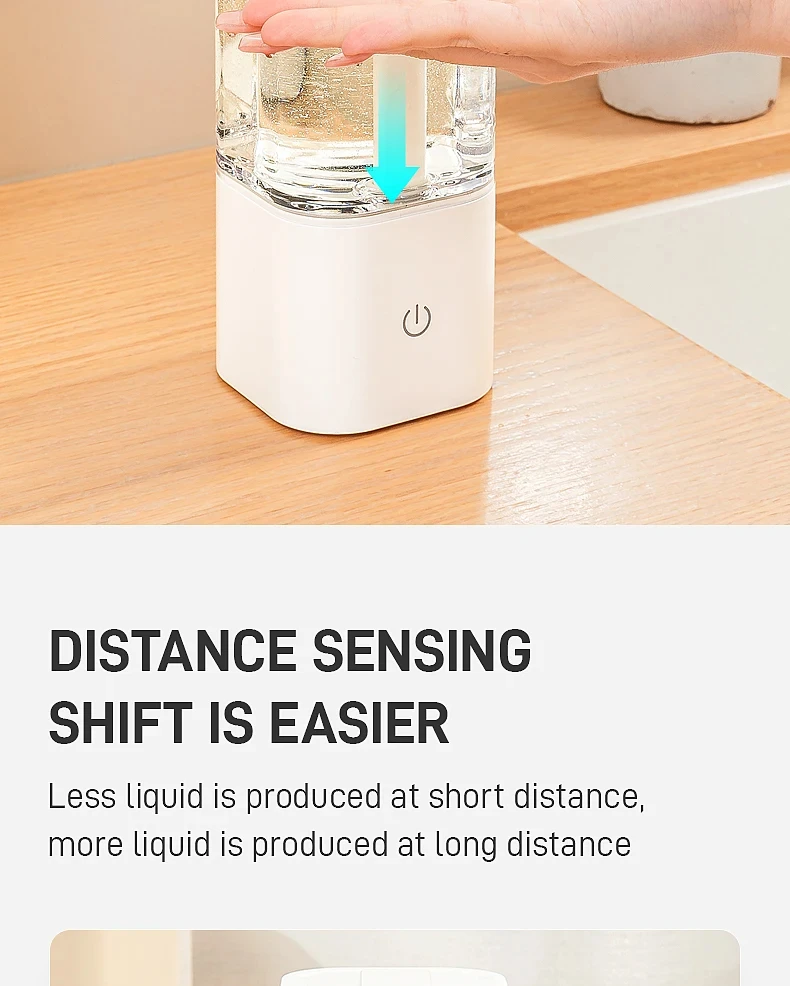 【Two-Gear Adjustable Discharge Volume】Equipped with high-precision infrared sensor, soap could be dispensed in 0.25S. There are 2 soap amount to choose- release soap for 0.3S 3g at low level and release for 0.8S 6g at high level. Soap level is controlled by the distance between hand and sensor-Get low amount in 0-4cm and get high amount in 4-8cm. It will stop to dispense when hand moves out from the sensor area.