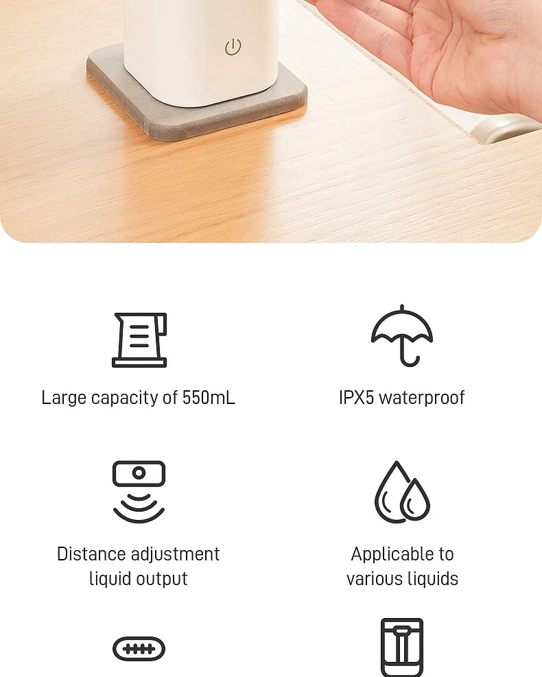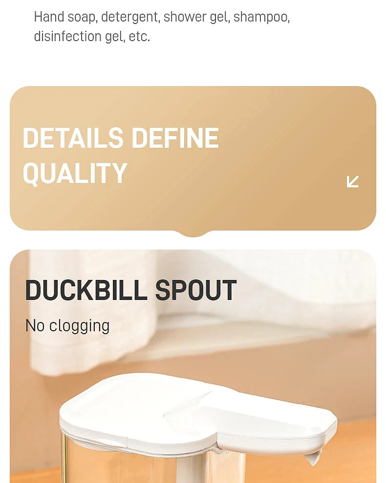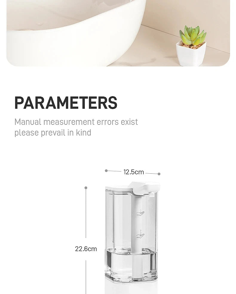 【Large Capacity Design】550ml large capacity liquid type dispenser! It is not necessary to add liquid frequently. The automatic hand sanitizer comes in a transparent bottle, which makes it easy to check the remaining amount of soap. This soap dispenser is suitable for all kinds of liquid soaps such as shampoo, dish soap, hand soap, laundry detergent, etc.