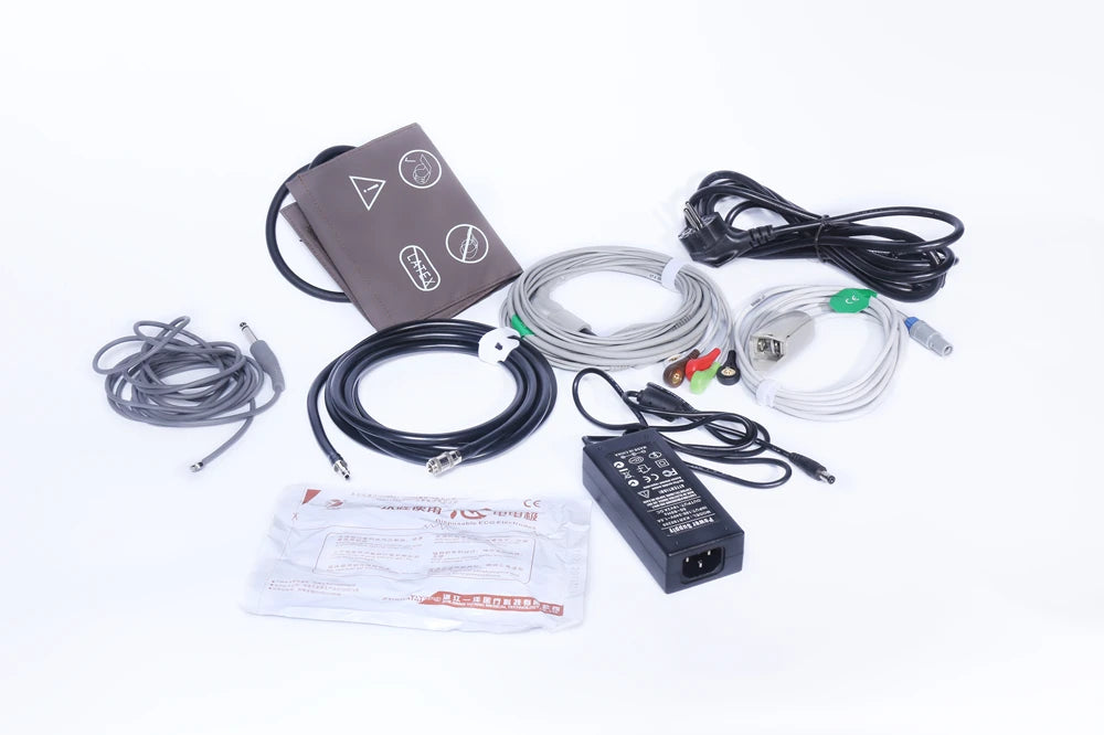 Monitor Main unit 1pc ECG cable(3 or 5leads) 1pc Adult Use Spo2 probe 1pc Adult use NIBP 1pc Temperature probe user manual(English) AC/DC power cord, power adapter, Ground electrode