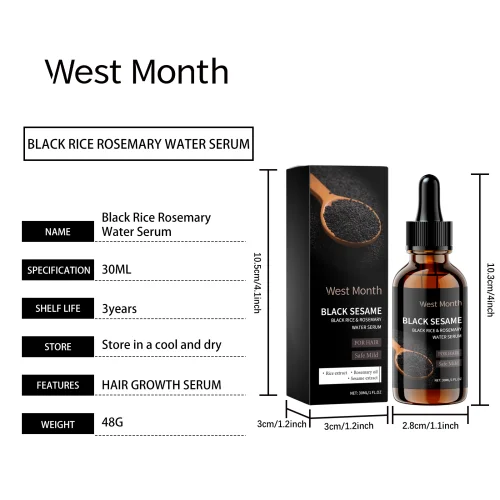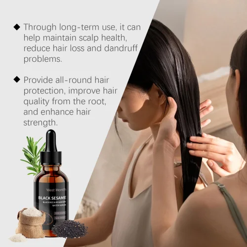 Our black sesame hair serum contains rosemary oil, vitamin E (tocopherol), which can focus on increasing the volume of your hair and making it look fuller and fuller. Its application is very simple: clean your hair and scalp, keep them dry, apply an appropriate amount of this product evenly to the hair and scalp, gently massage until absorbed. And can deeply nourish the hair root, help repair fragile hair, effectively reduce hair breakage and hair loss problems.